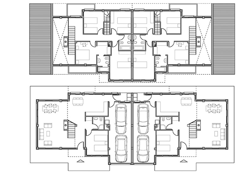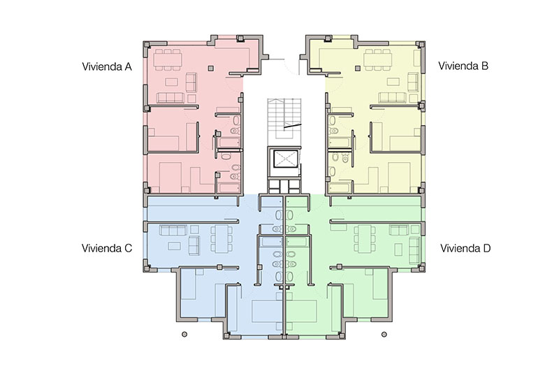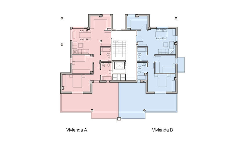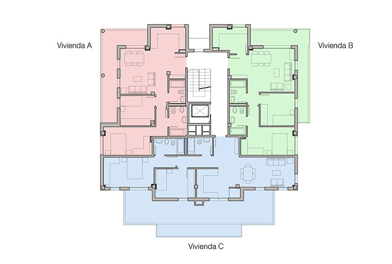 Habitaciones: 3 dormitorios y 2 baños por vivienda